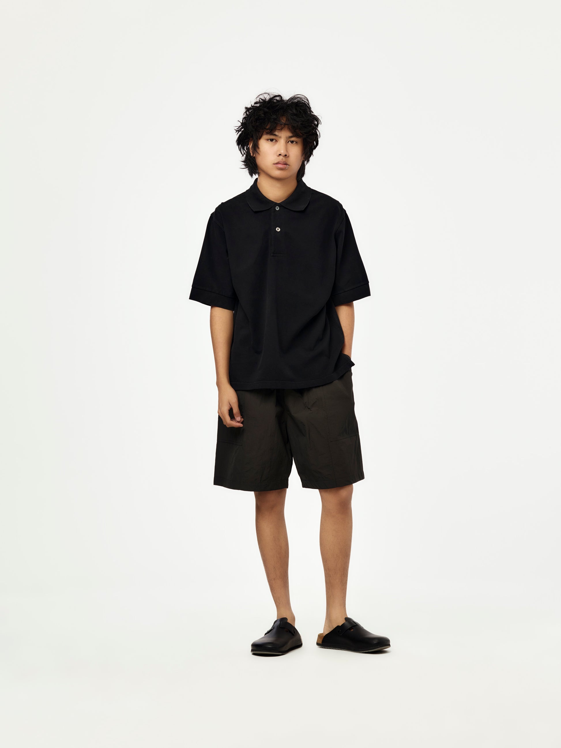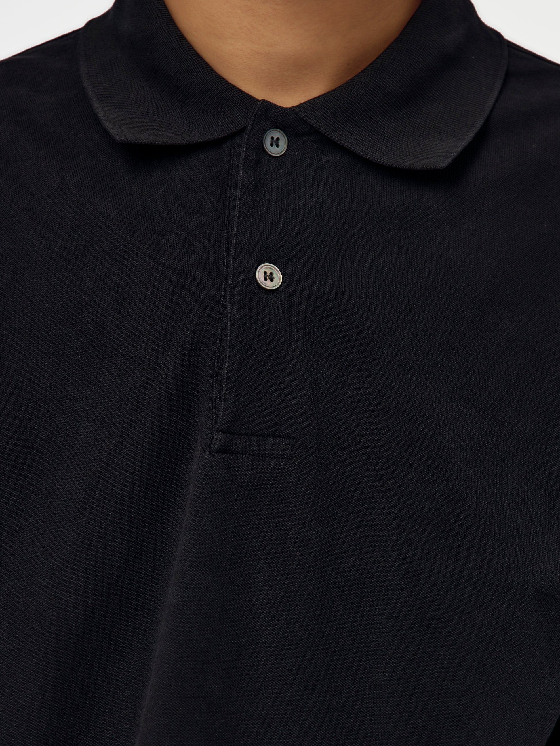 The Balaton Polo reimagines a classic silhouette through Studio Nicholson’s minimalist lens. Designed with a relaxed fit and clean short-sleeve construction, the piece balances casual comfort with refined structure. The washed black finish adds subtle texture, making it an easy staple for everyday wear.