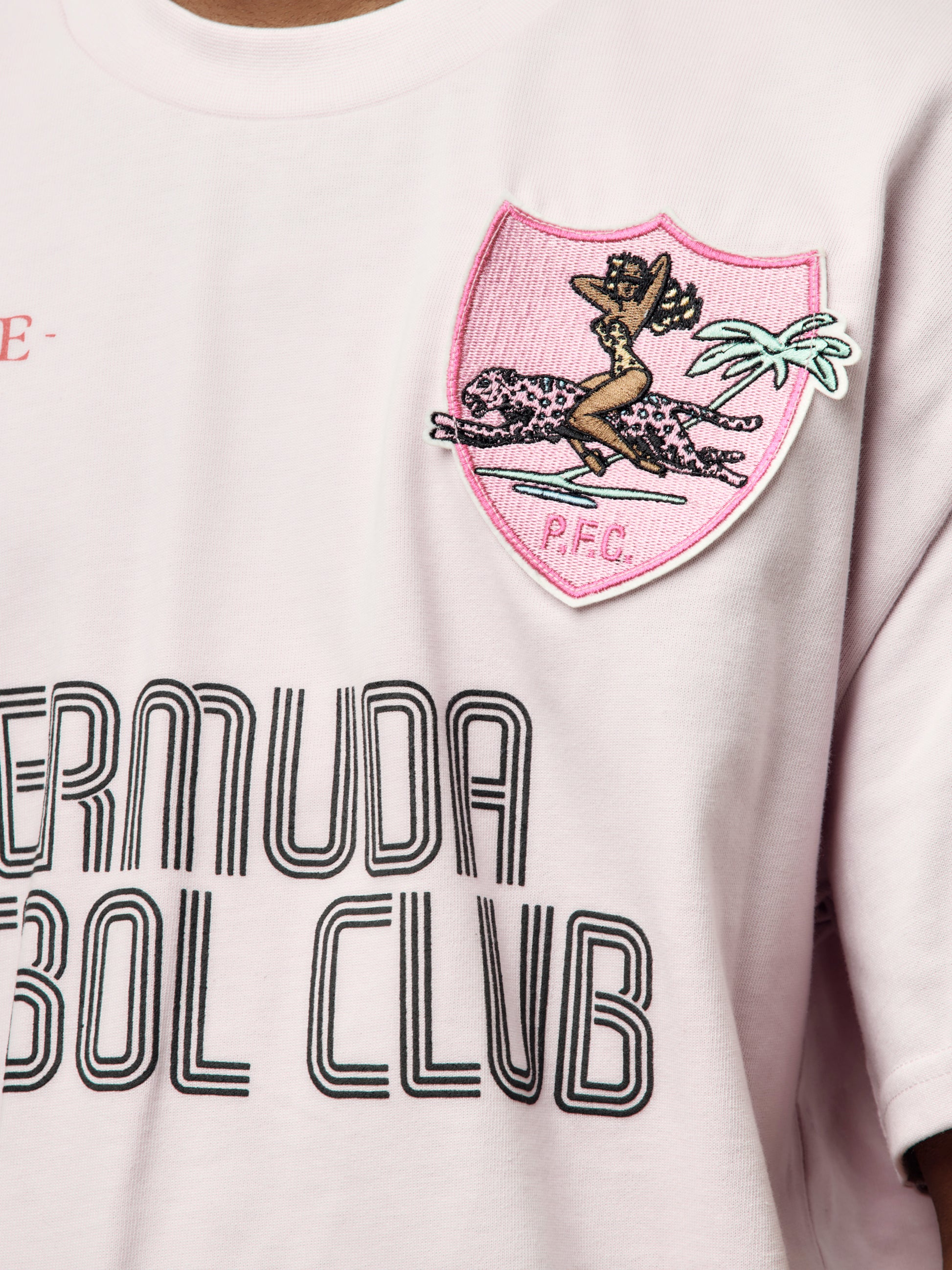 A coastal remix on a classic sport style. The Bermuda Futbul tee uses pastel shell-pink cotton and graphic details that reflect a sun-washed team at ease. It’s retro kit energy, softened by The Paradise Suite’s understated, resort-ready aesthetic.