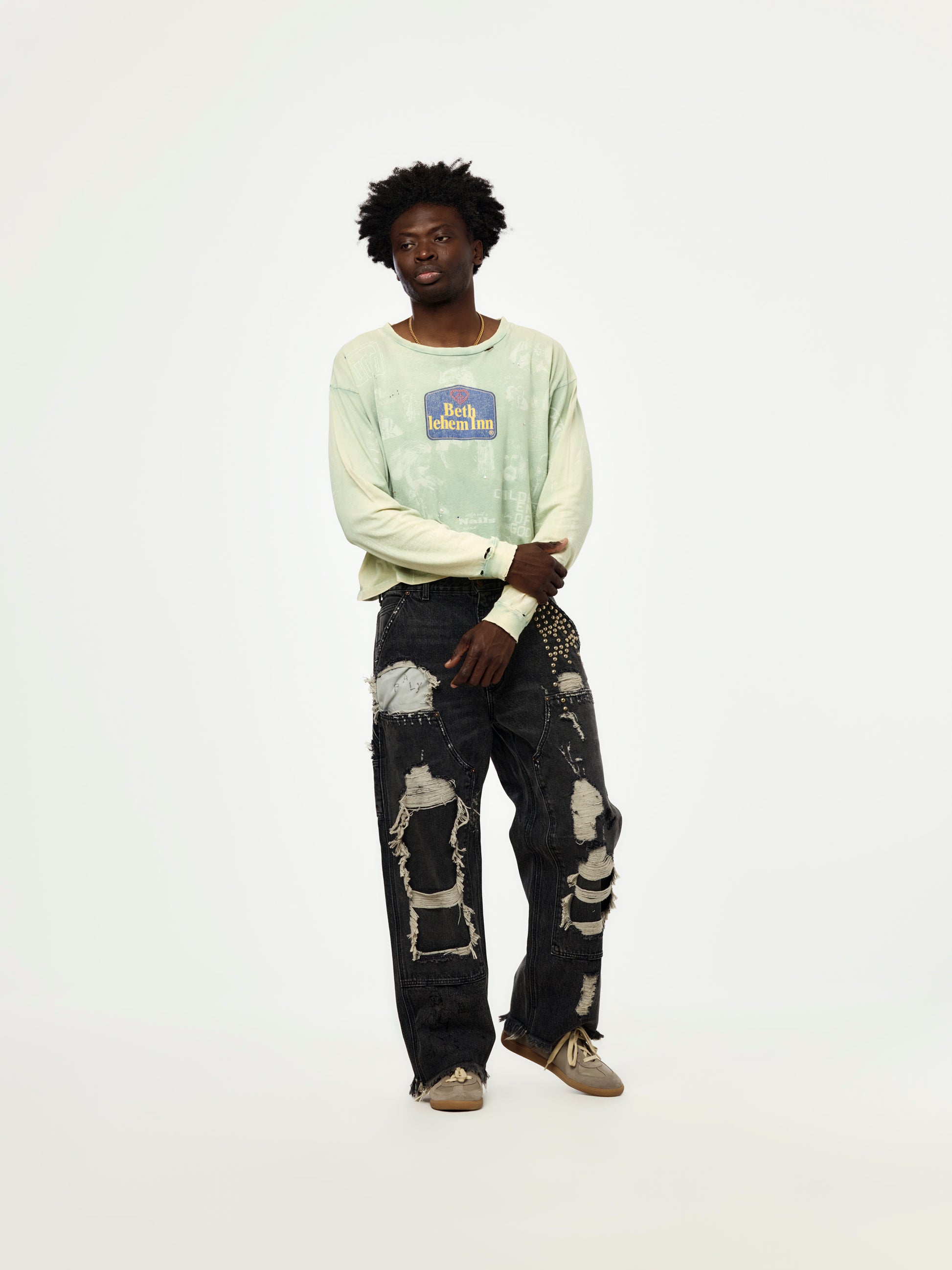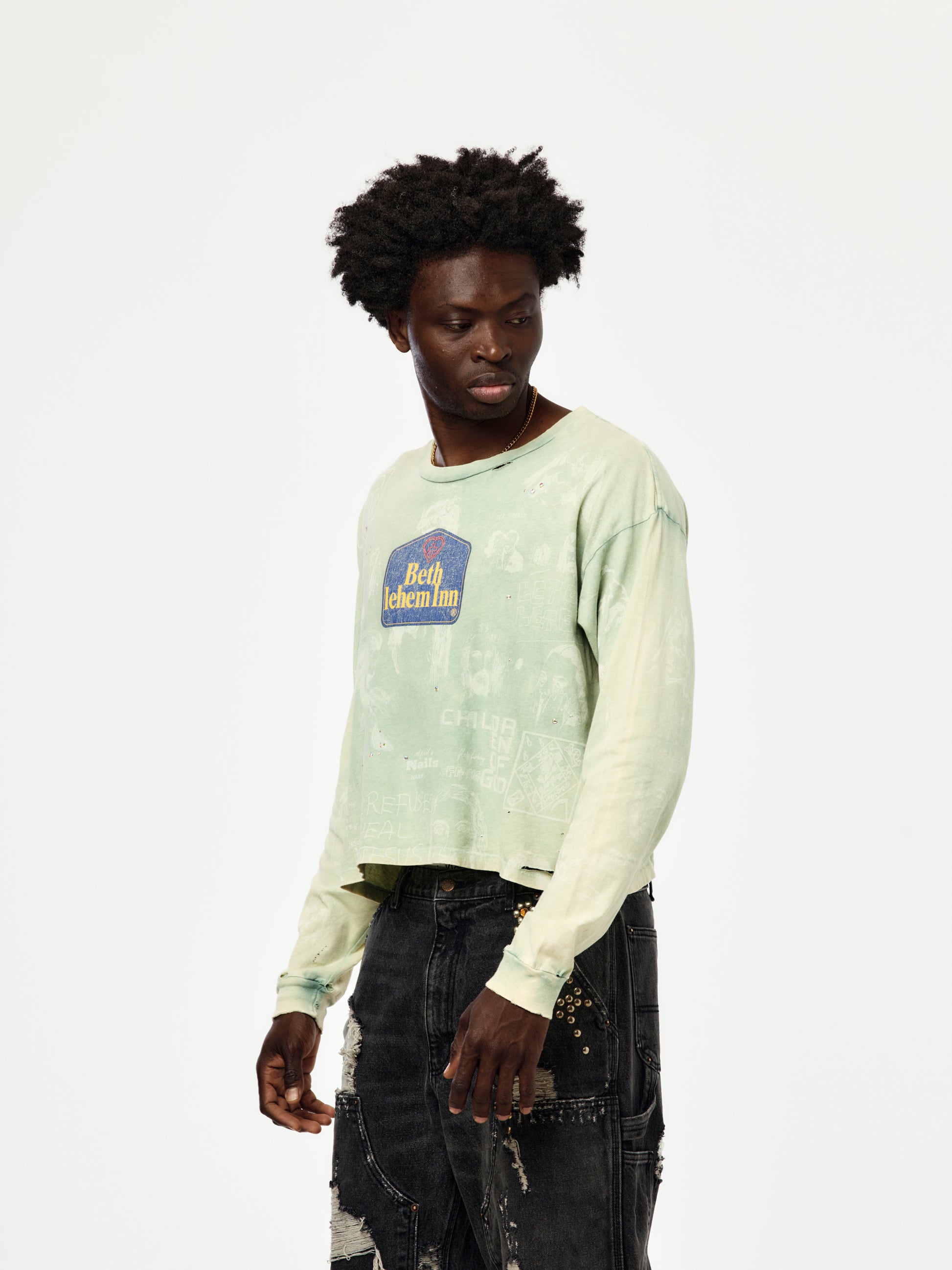 Paly Hollywood's most densely graphic piece in the SS26 collection. An all-over printed long-sleeve tee in washed green — layered with faded photographic imagery, hand-lettered text, religious iconography, and the "Bethlehem Inn" motif at the chest. "Pride refuses to heal but Jesus" printed across the lower body. The vintage wash gives every print a faded, sunbleached quality — like something pulled from the back of a closet that's been there since 1994. Cropped relaxed fit, raw neckline.