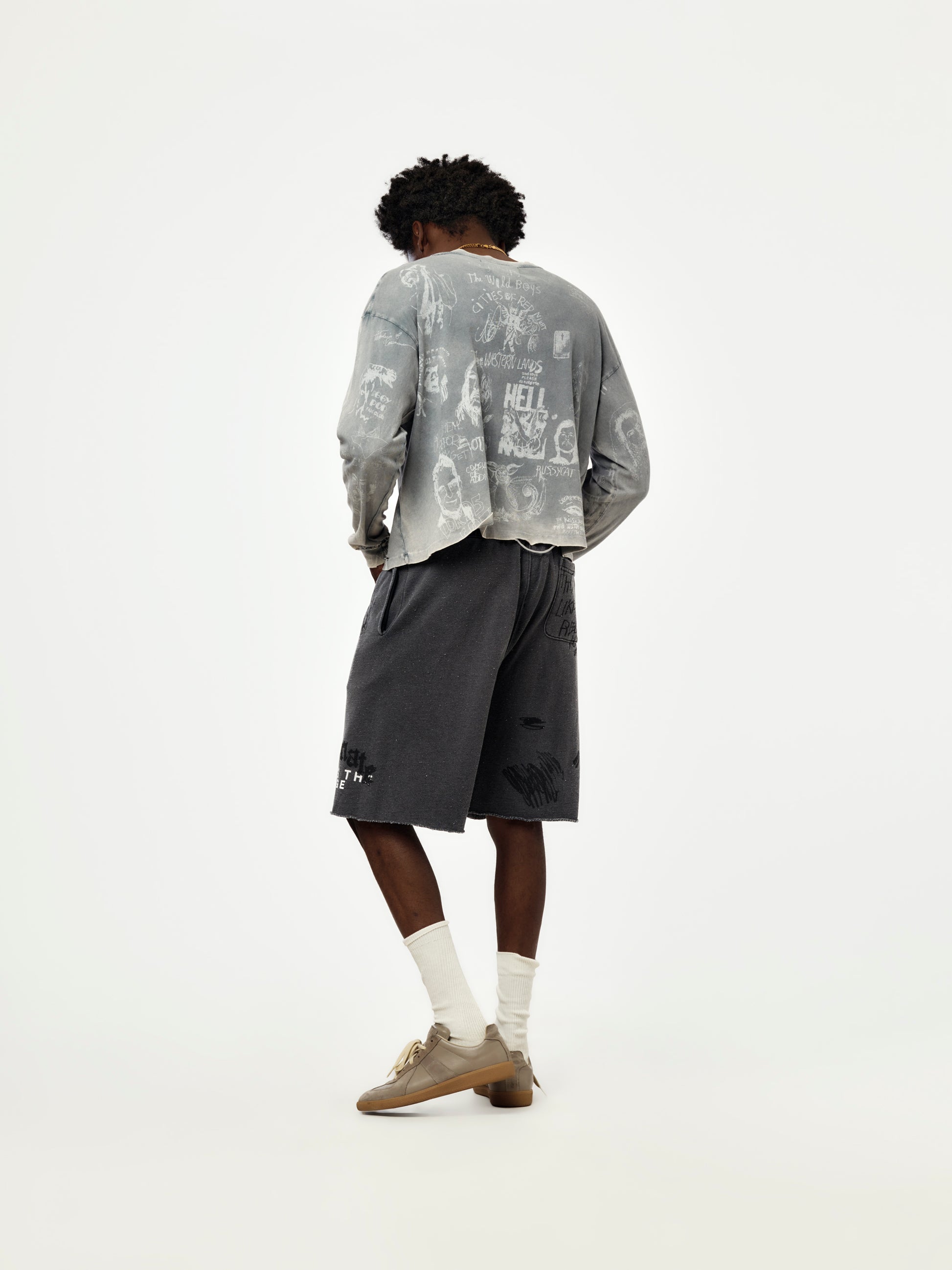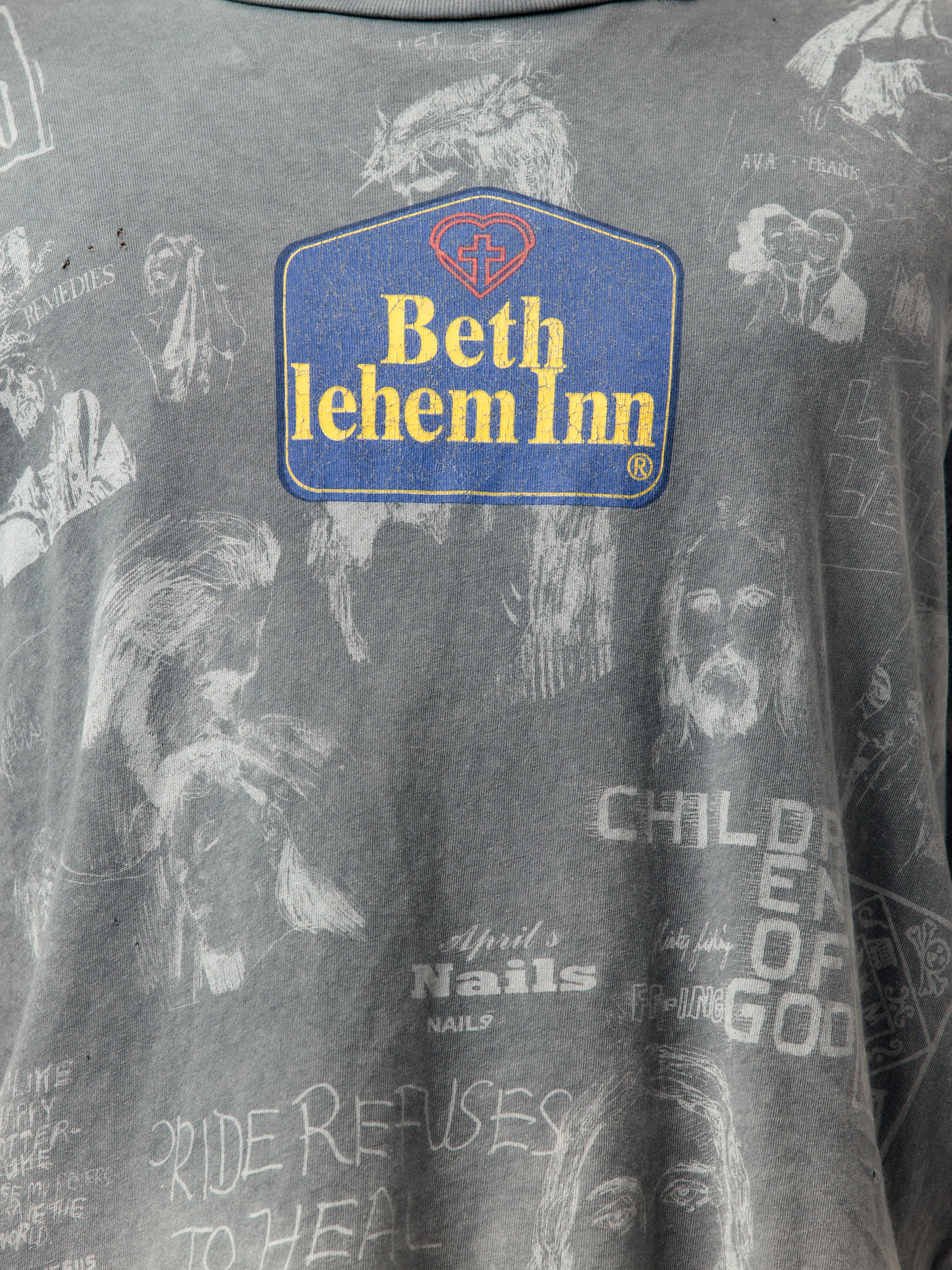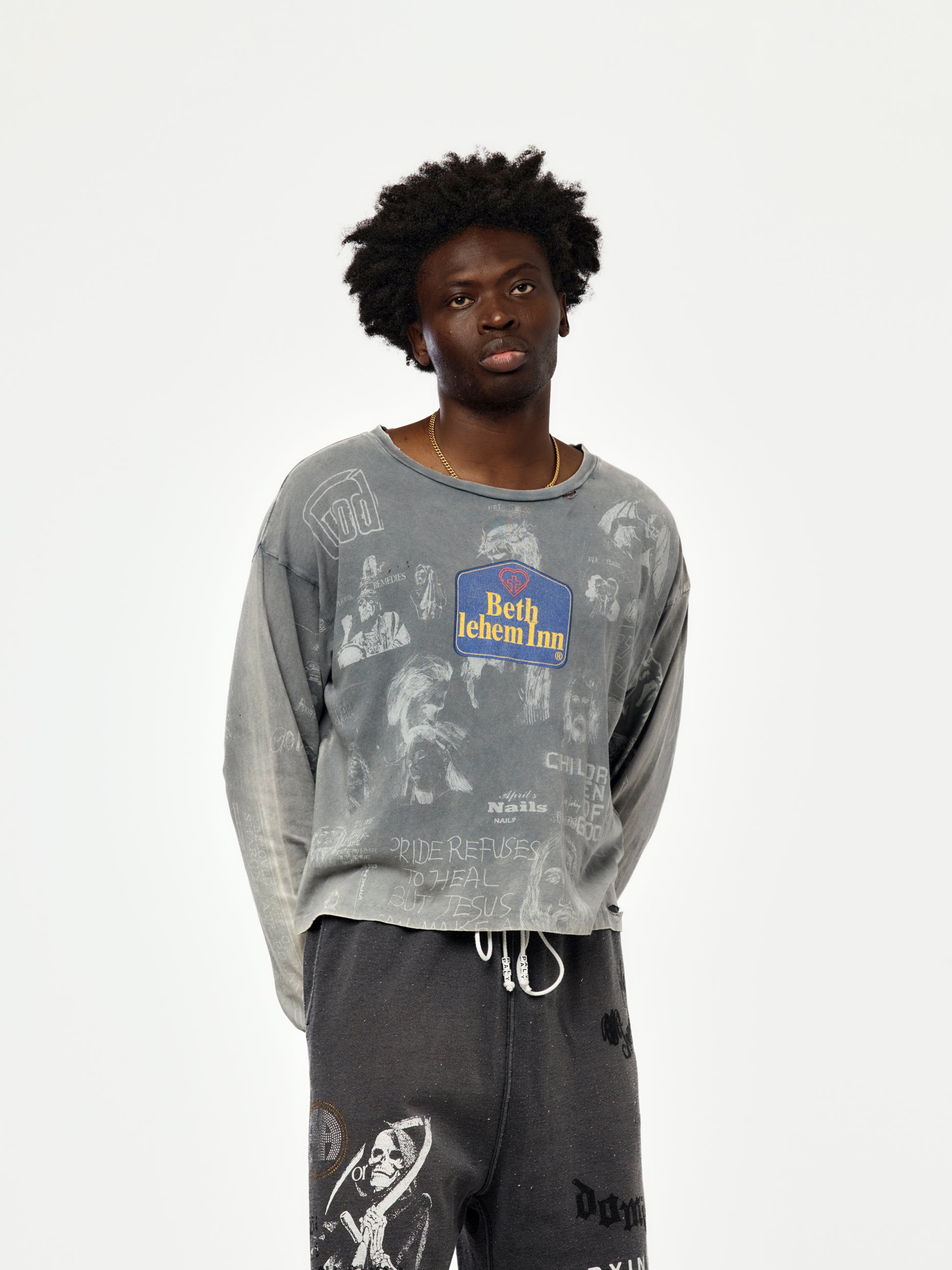 Paly Hollywood's most densely graphic piece in the SS26 collection. An all-over printed long-sleeve tee in vintage black — layered with faded photographic imagery, hand-lettered text, religious iconography, and the "Bethlehem Inn" motif at the chest. "Pride refuses to heal but Jesus" printed across the lower body. The vintage wash gives every print a faded, sunbleached quality — like something pulled from the back of a closet that's been there since 1994. Cropped relaxed fit, raw neckline.