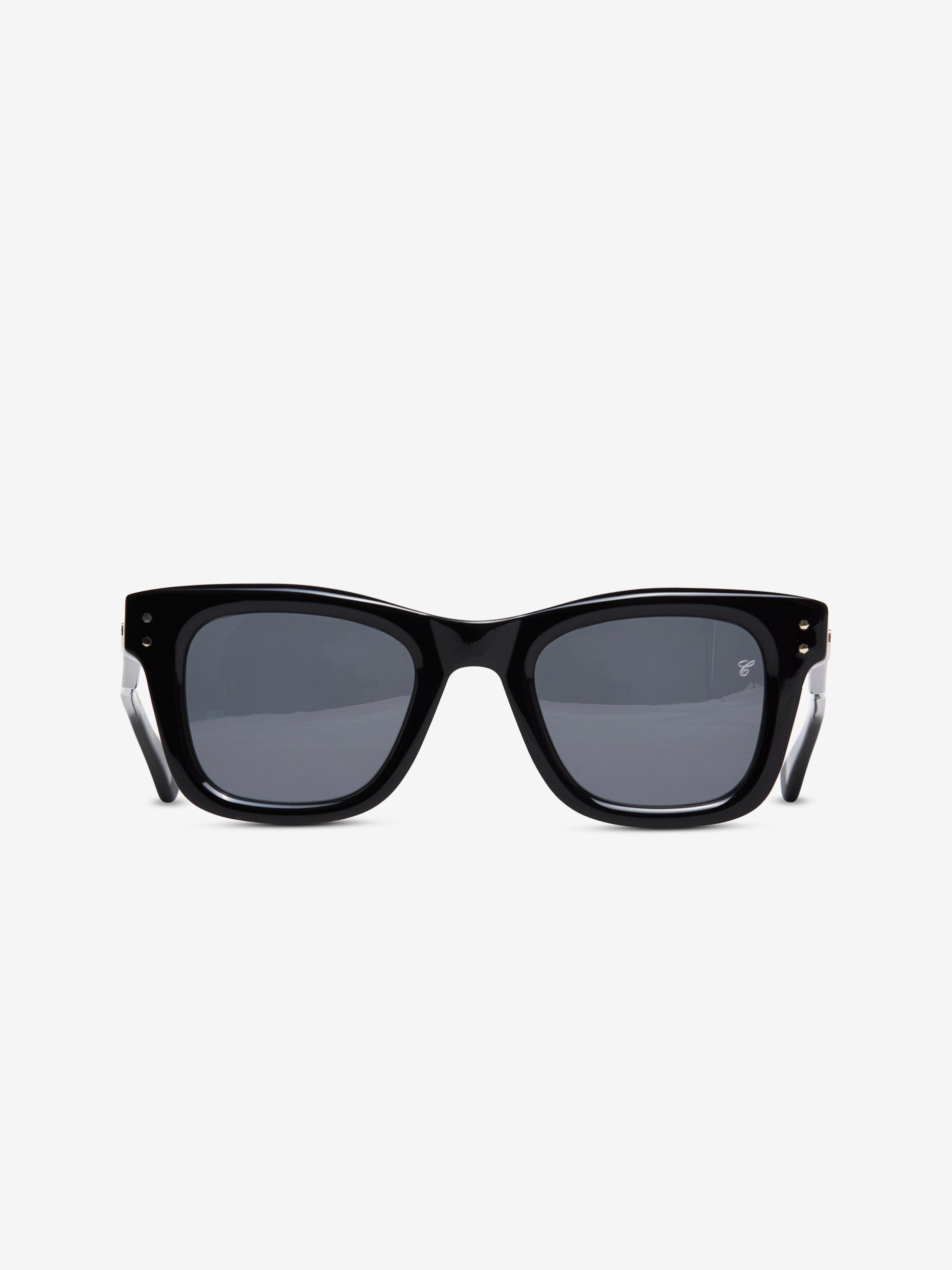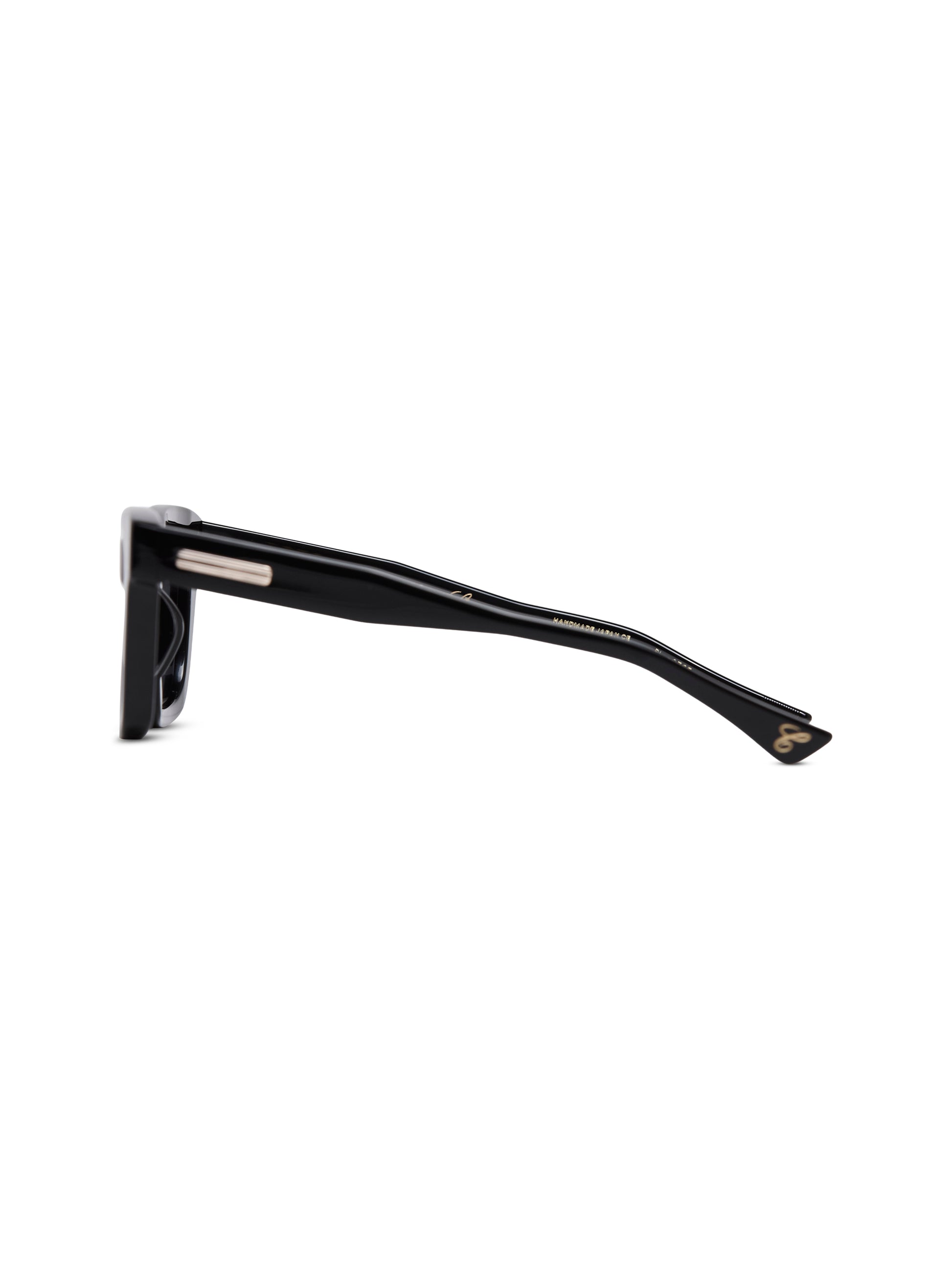 A bold, full-face square Wellington shape with a dipped nose bridge and strong visual presence. The top bridge sweeps subtly and skives beautifully into squared temple connections, reinforced with vertical double hex rivets. Sculpted from 8mm acetate sheets for a lightweight yet substantial fit. The temple design starts bold and square at the hinge and tapers smoothly toward the ear for comfort.