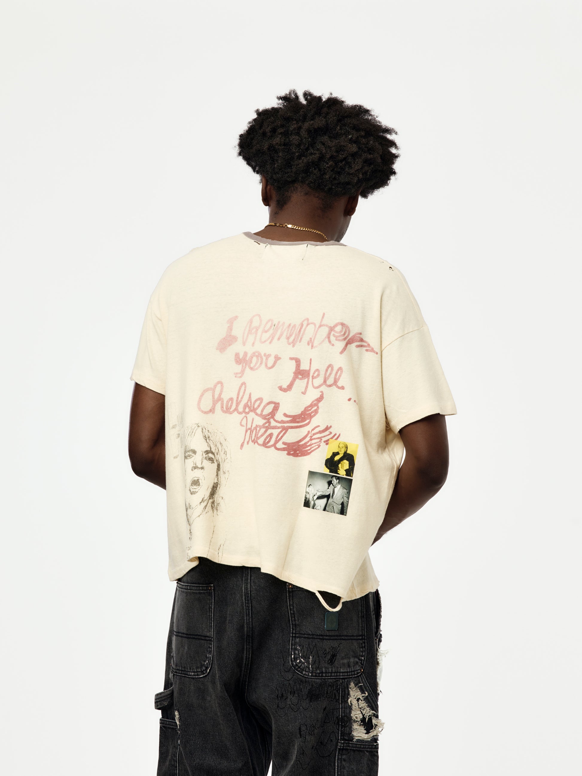 The Chelsea Hotel — one of New York's most mythologized addresses, home to artists, musicians, and outlaws — rendered in James Franco's hand-drawn illustration style across the chest of a vintage cream cotton tee. Red paint splatter and handwritten script notes below the illustration. Raw neckline and hem. Distressed throughout with the worn-in quality Paly Hollywood builds into every piece from the start. A piece rooted in cultural memory.