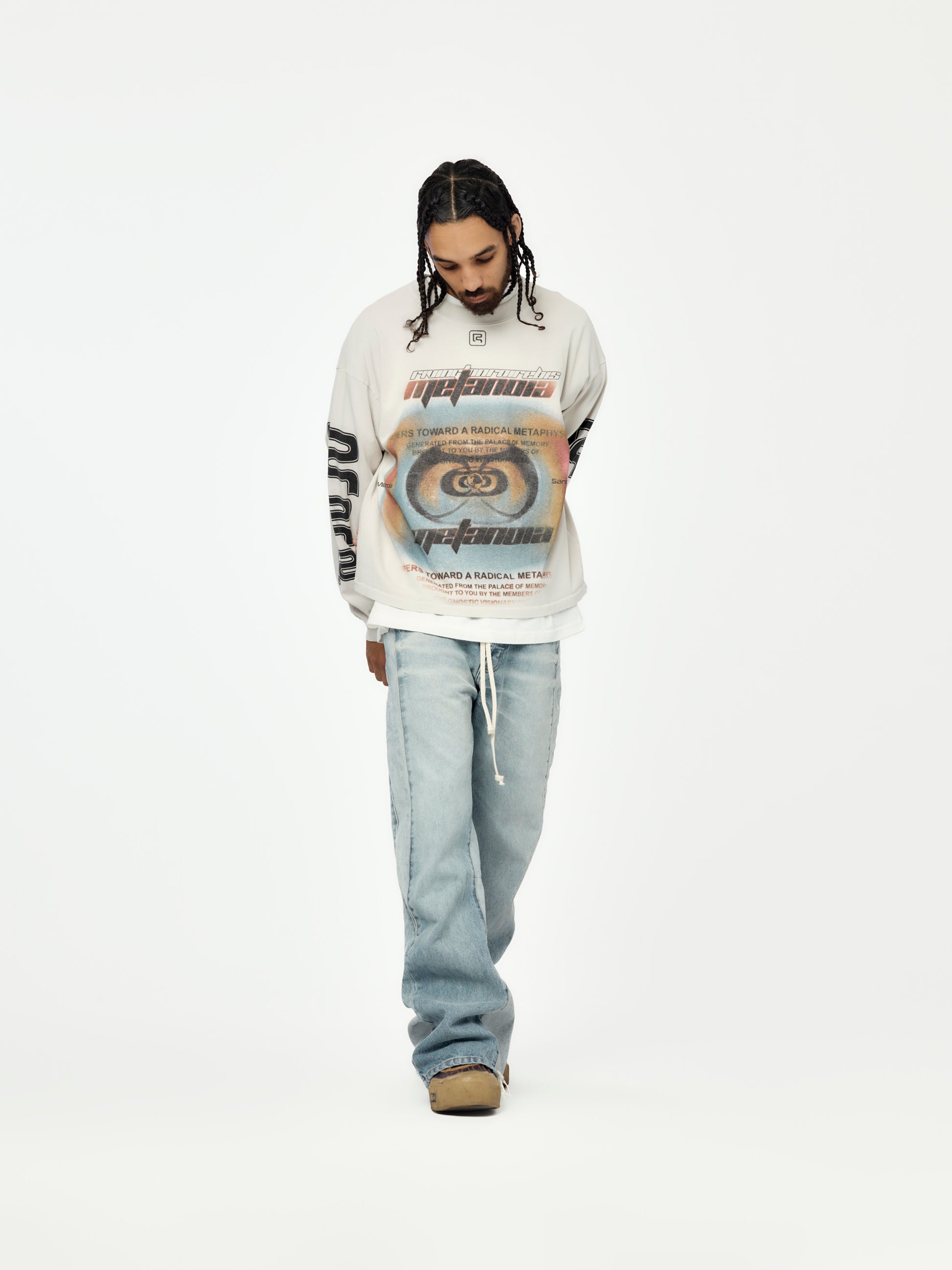 A softer palette grounds the Divinity Paper Garden LS Tee in Light Grey, layering intricate graphic work over an oversized long-sleeve body.
