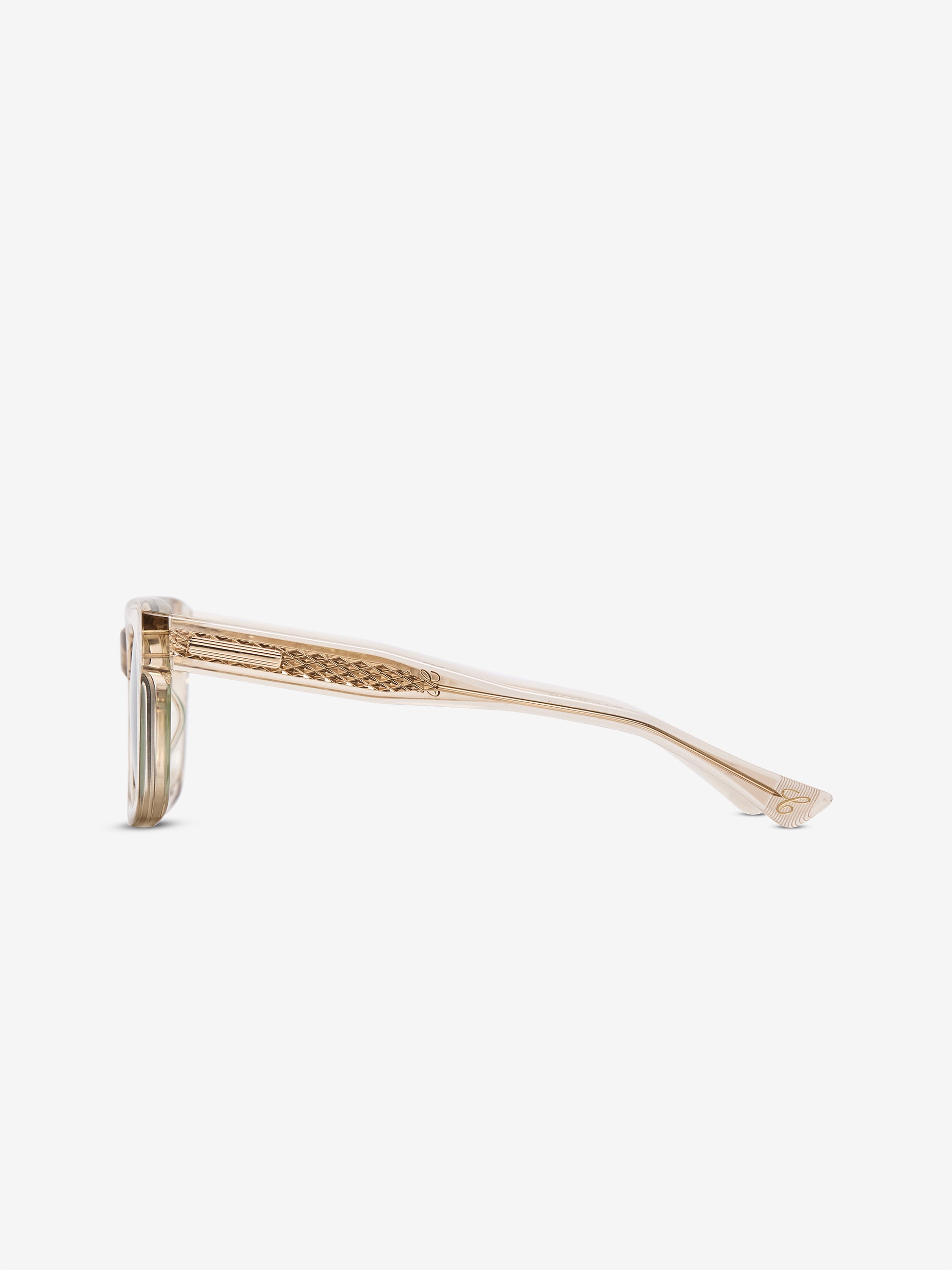 A bold, full-face square Wellington shape with a dipped nose bridge and strong visual presence. The top bridge sweeps subtly and skives beautifully into squared temple connections, reinforced with vertical double hex rivets. Sculpted from 8mm acetate sheets for a lightweight yet substantial fit. The temple design starts bold and square at the hinge and tapers smoothly toward the ear for comfort.