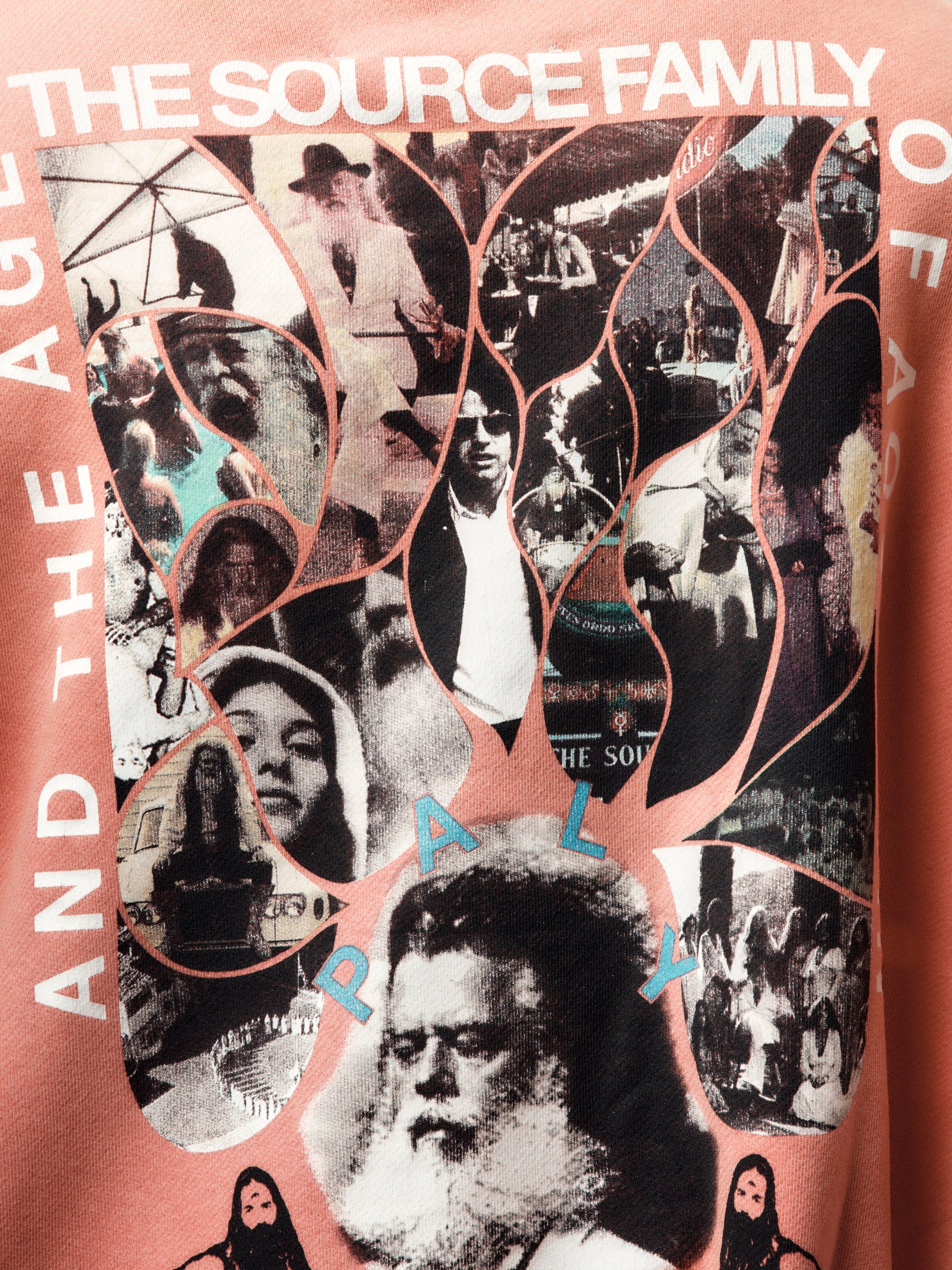The Source Family Hoodie dives into cult history through Paly’s offbeat lens. Bright orange cotton fleece with bold artwork that toes the line between homage and irony. Equal parts comfort, chaos, and counterculture.