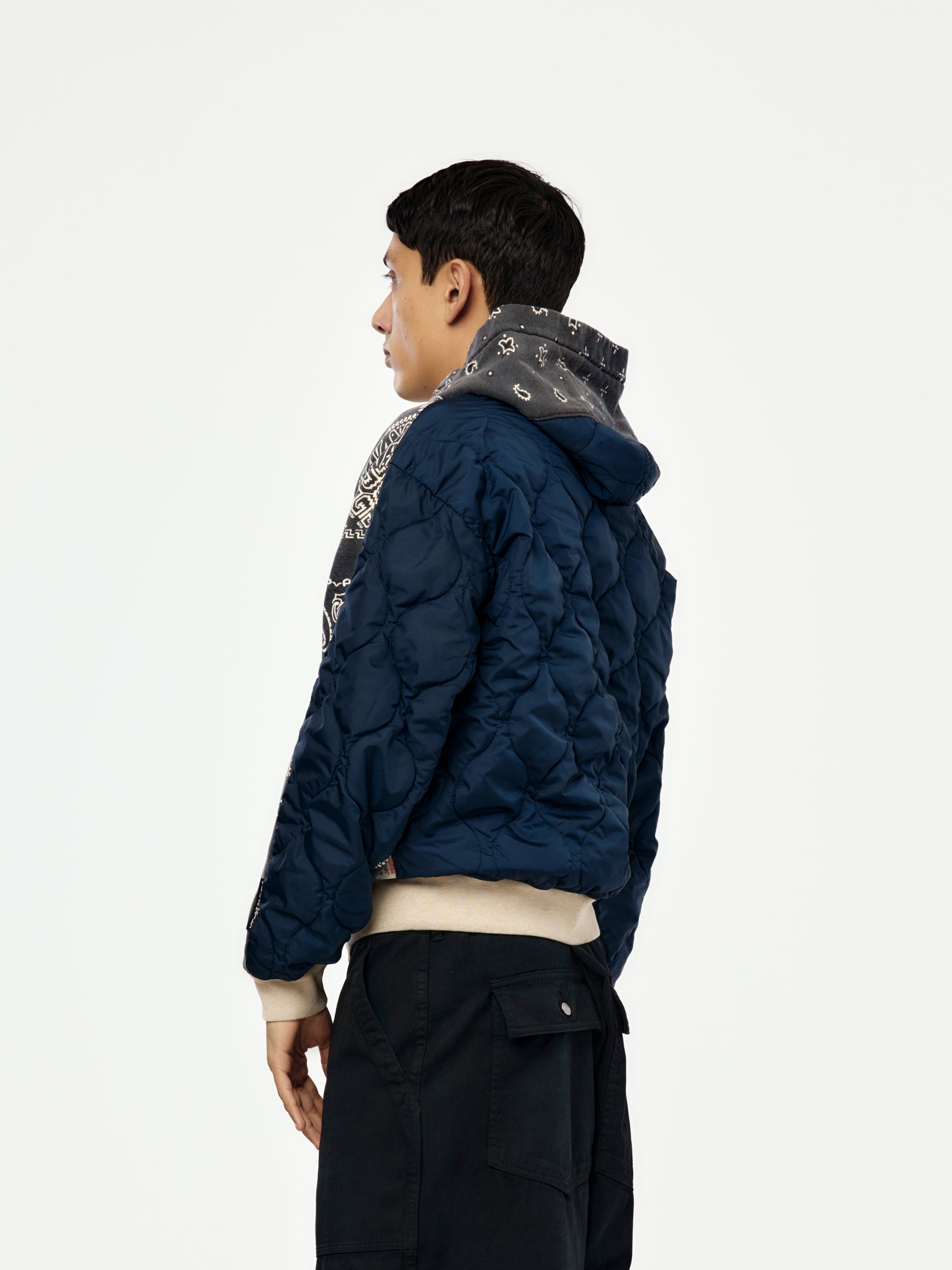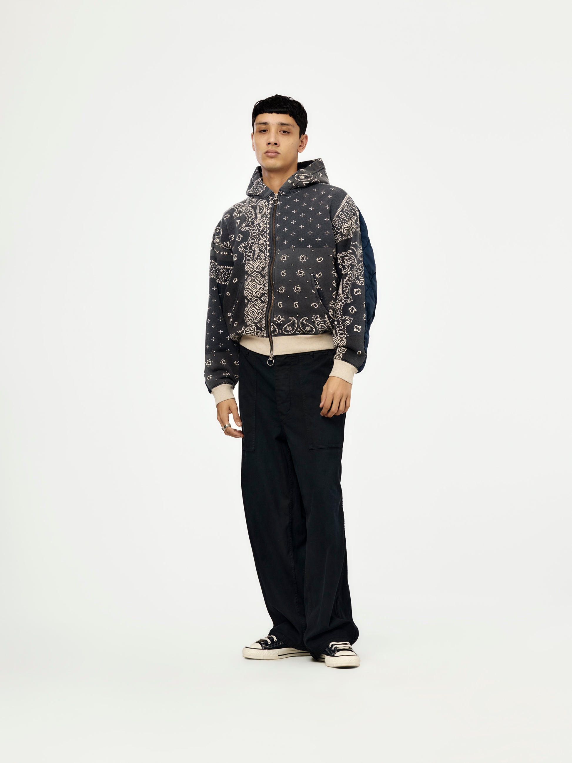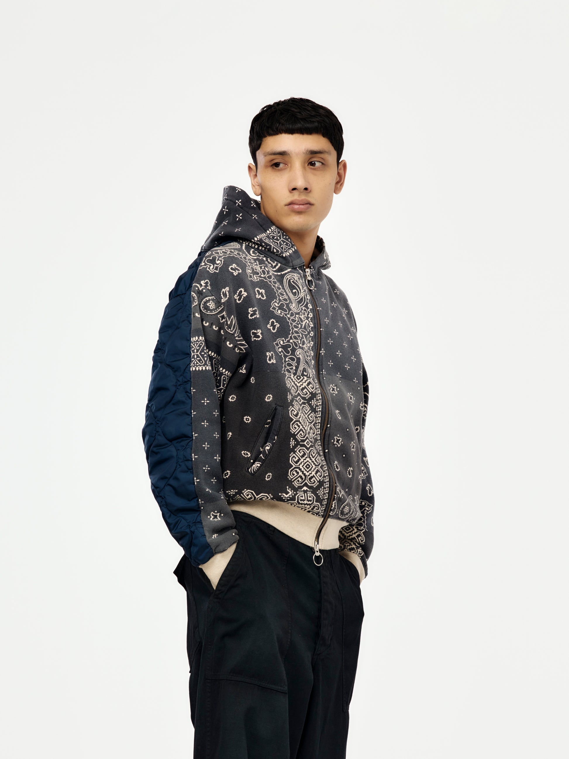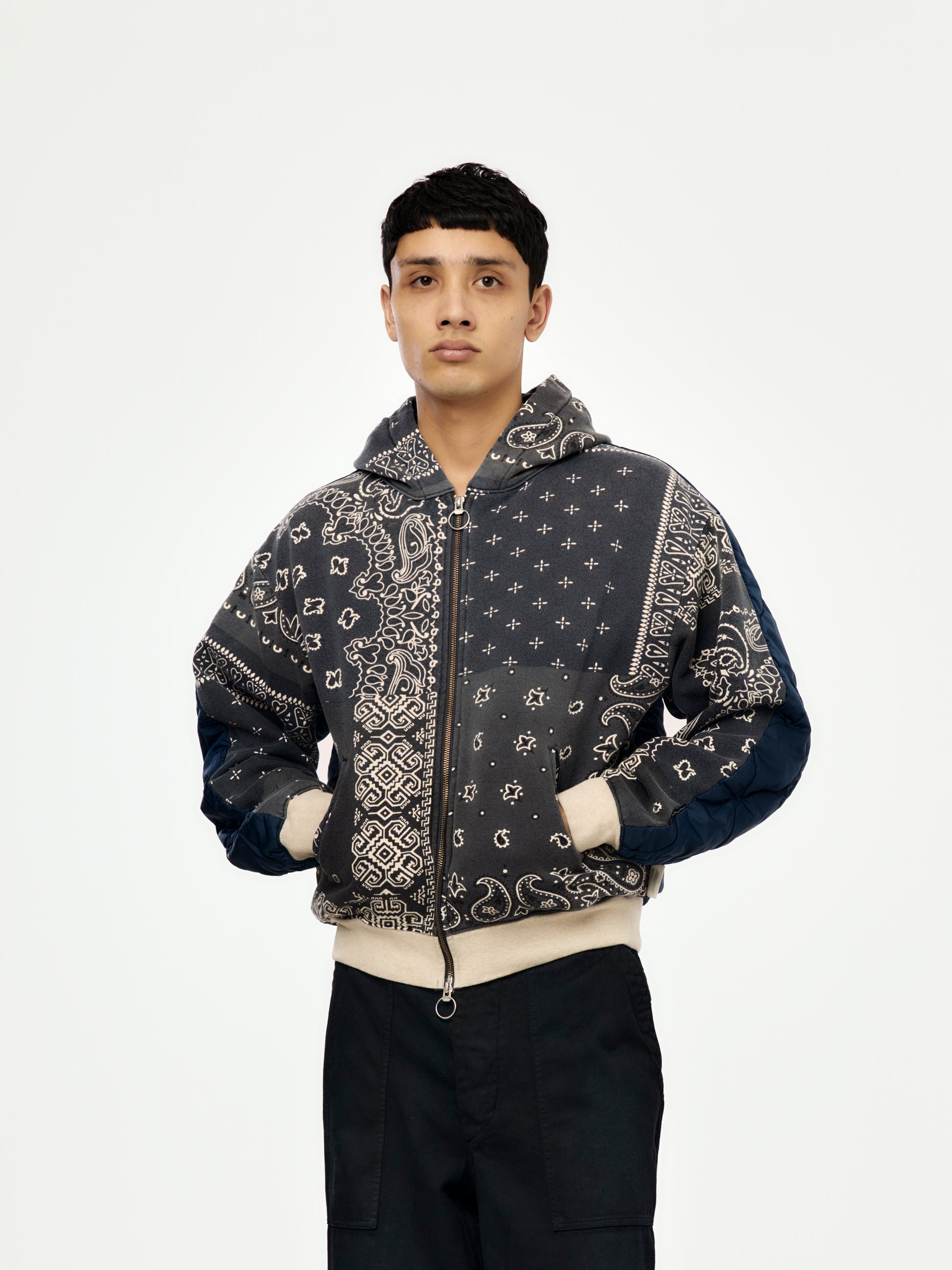 A statement hooded blouson in Kapital’s knit bandana language; textural and layered.