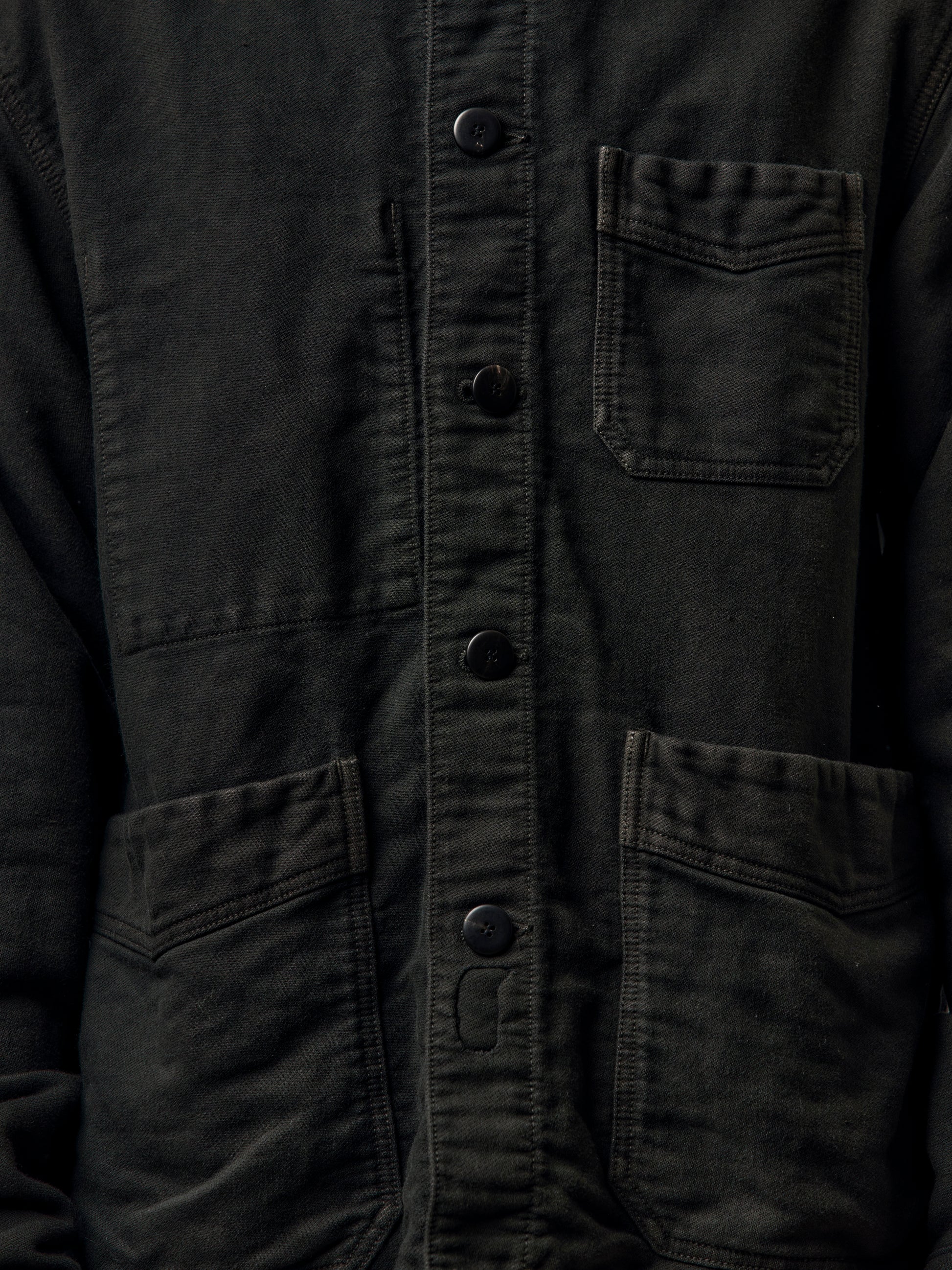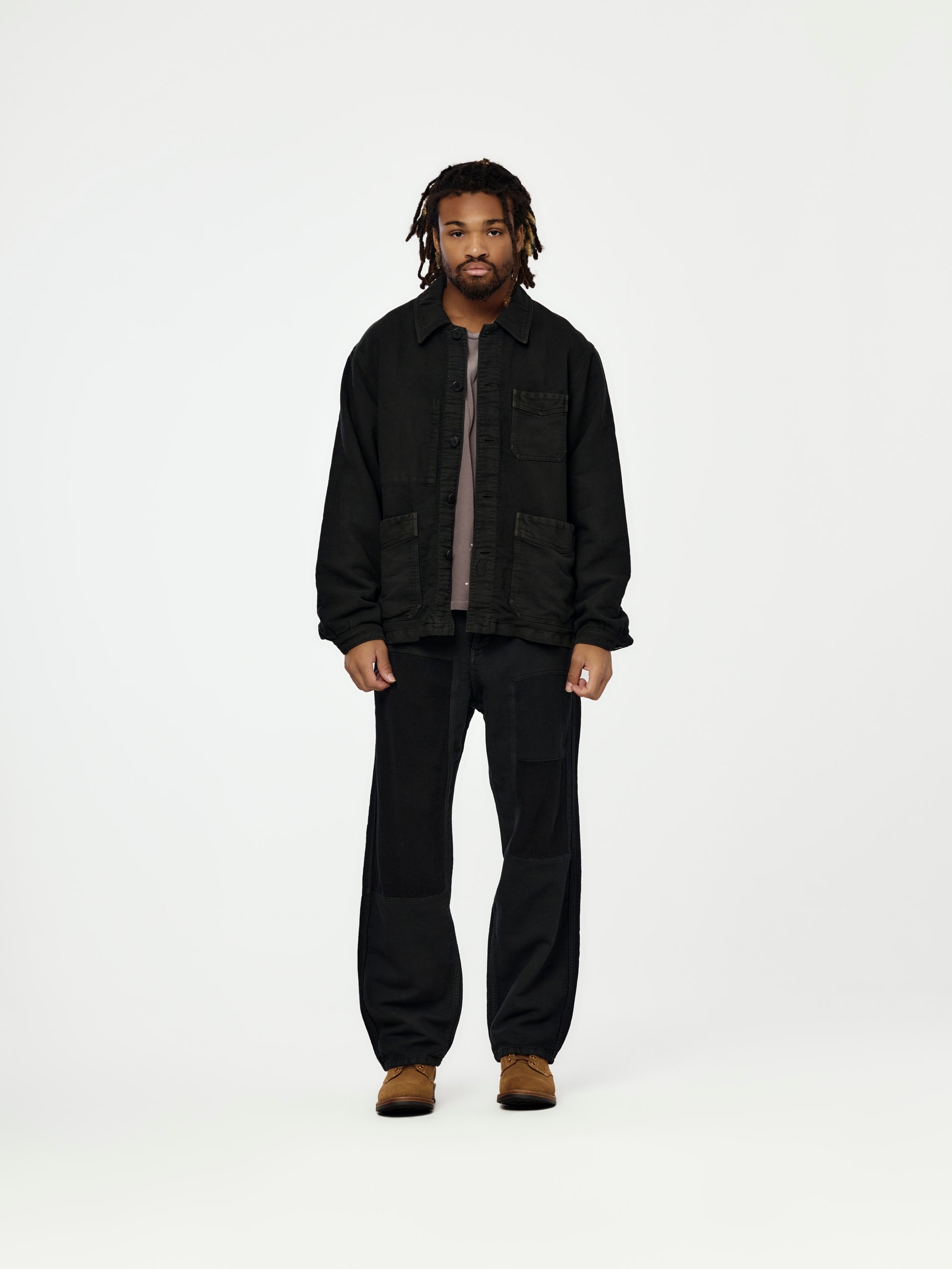 The Travail Coverall in DMGD Black reworks classic—cut from durable moleskin with a distressed finish that brings depth and character. A utilitarian jumpsuit built for layering, it blends rugged construction with everyday wearability.