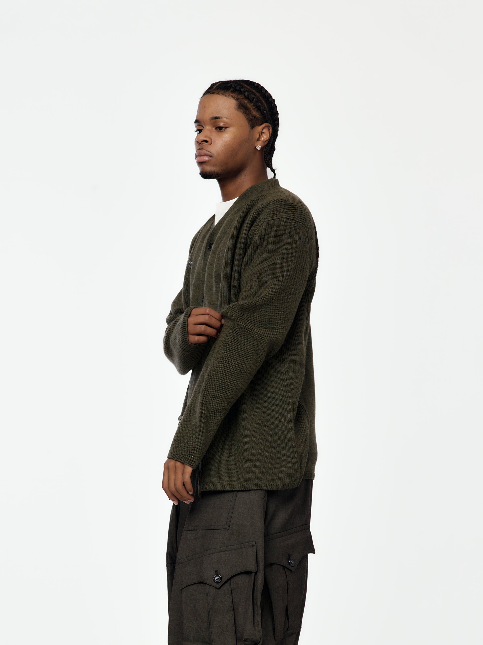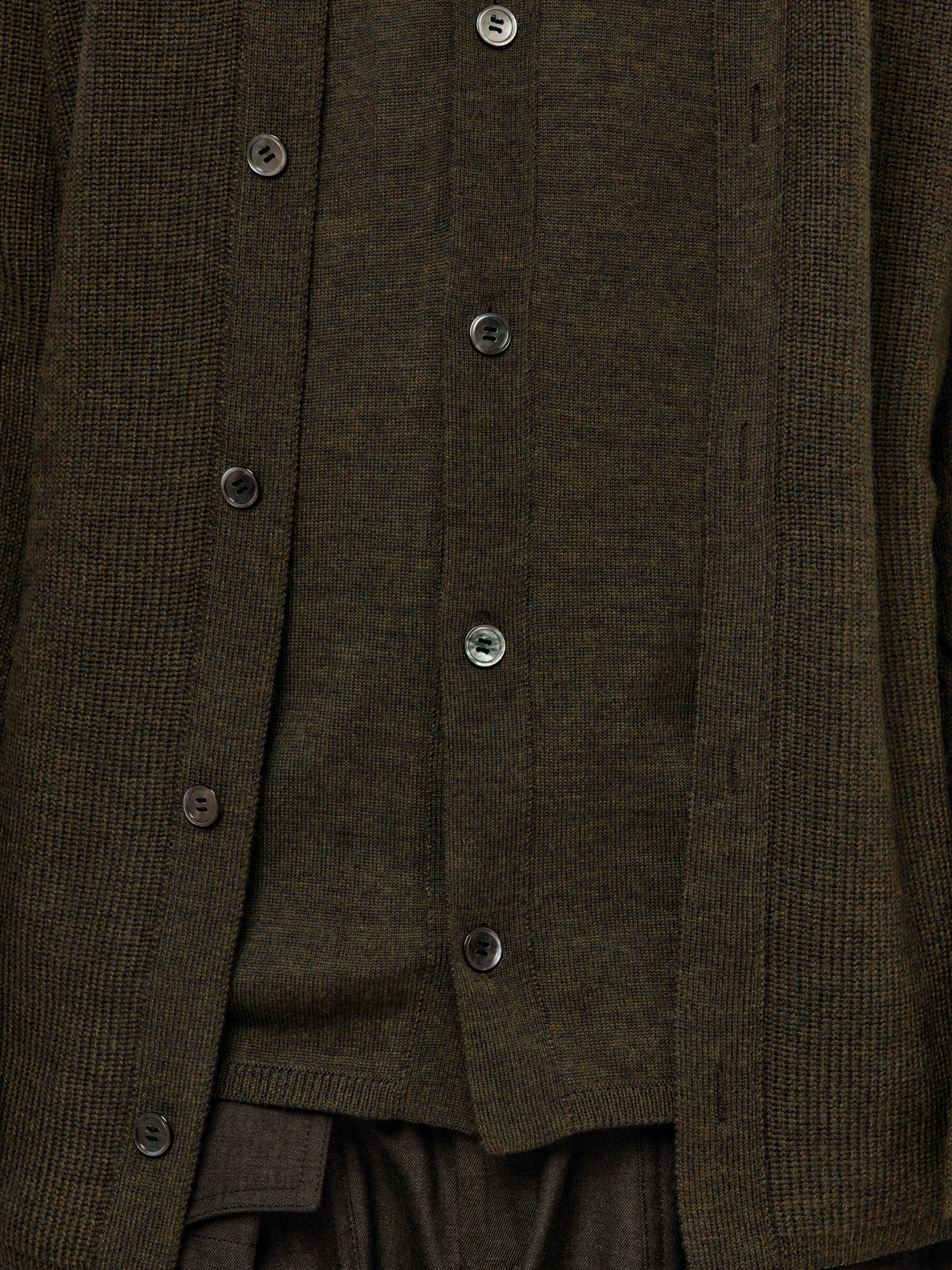 Comme des Garçons Homme Plus reimagines a timeless layering piece through its signature lens of subversion and precision. The Wool Cardigan arrives in a deep olive tone, crafted from soft yet structured knit wool for warmth and drape. Designed with dropped shoulders, elongated sleeves, and tonal buttons, it balances formality and ease — understated on the surface, quietly experimental underneath. A versatile layer that embodies CDG’s approach to everyday avant-garde dressing.