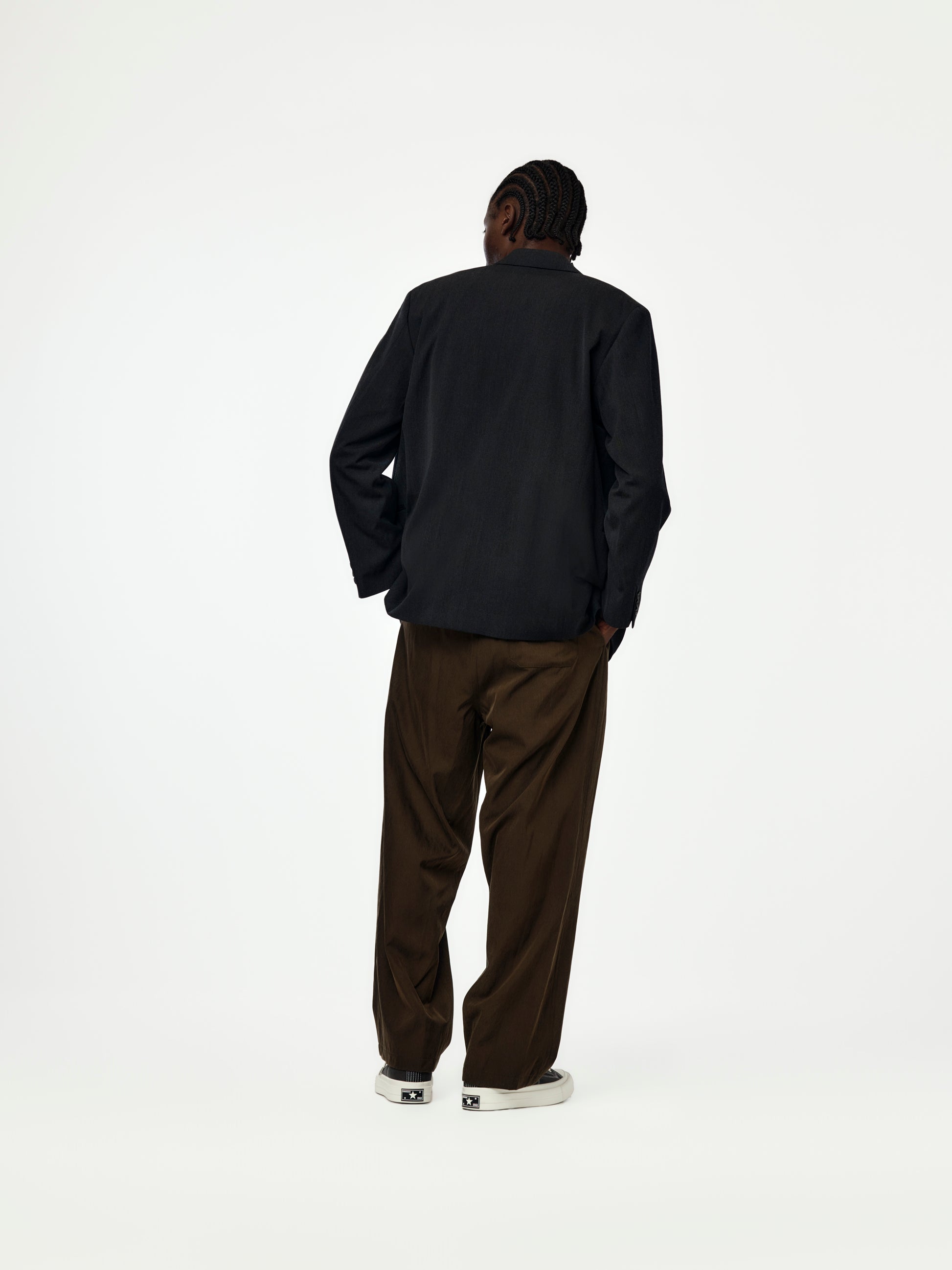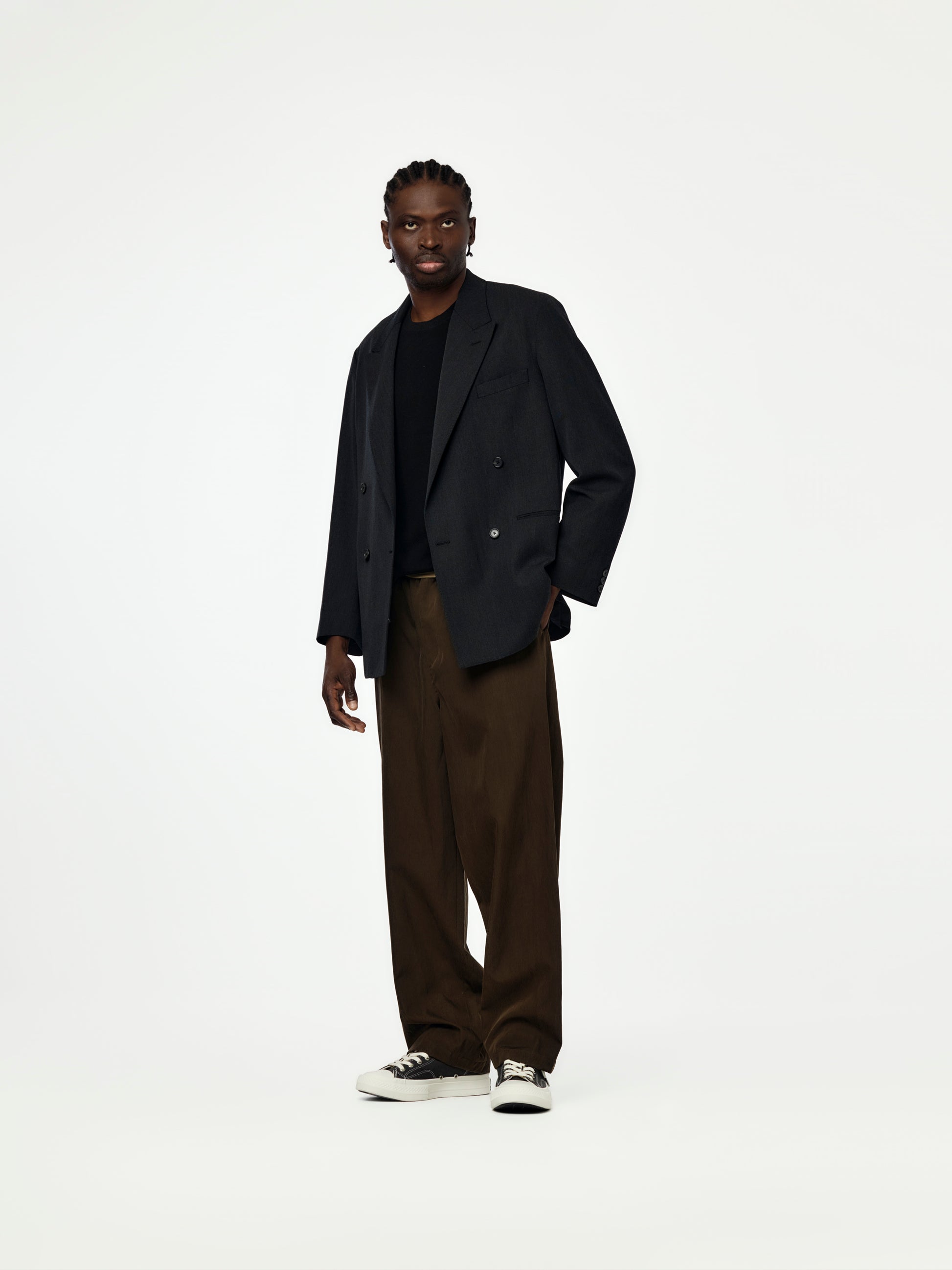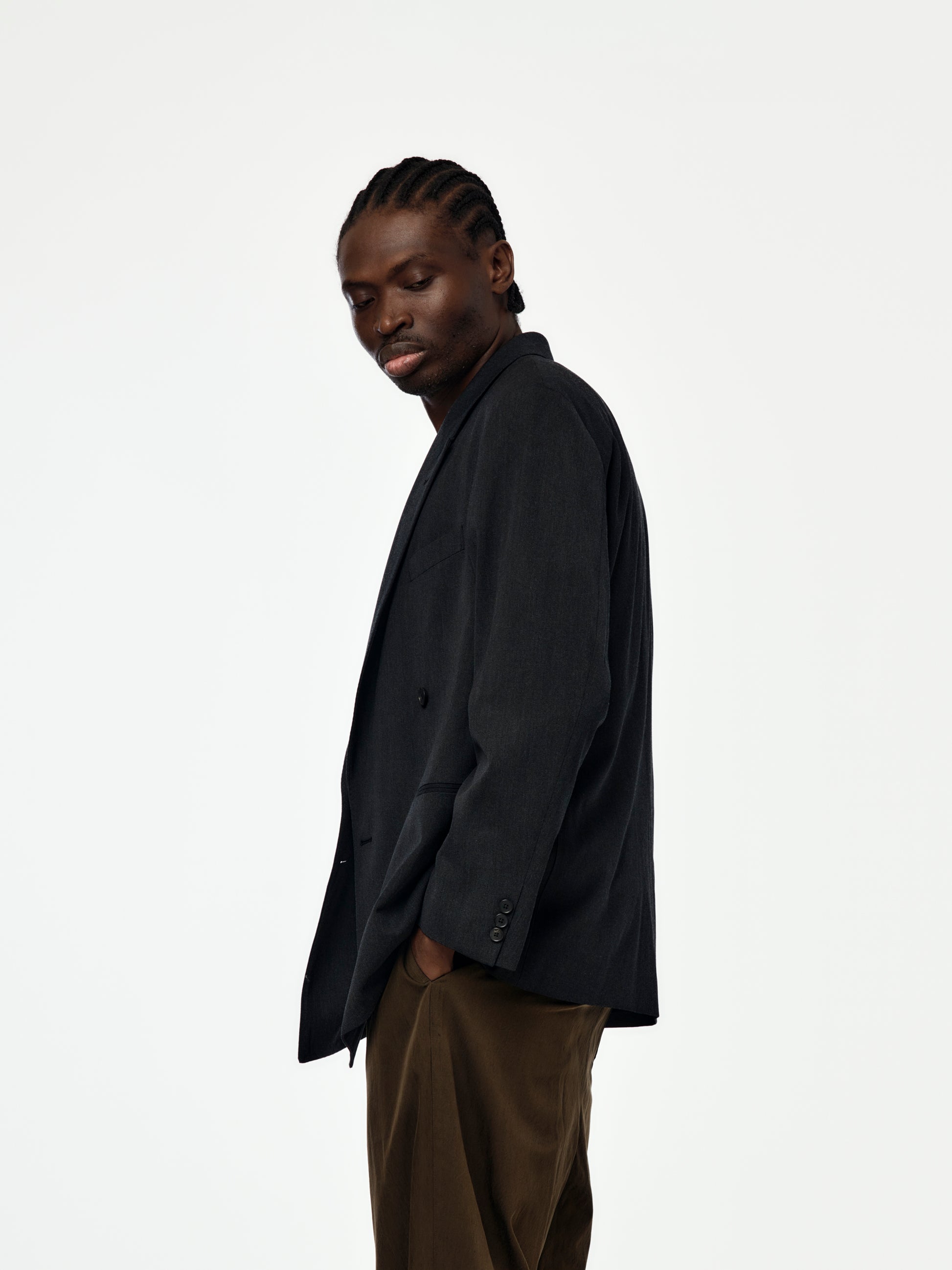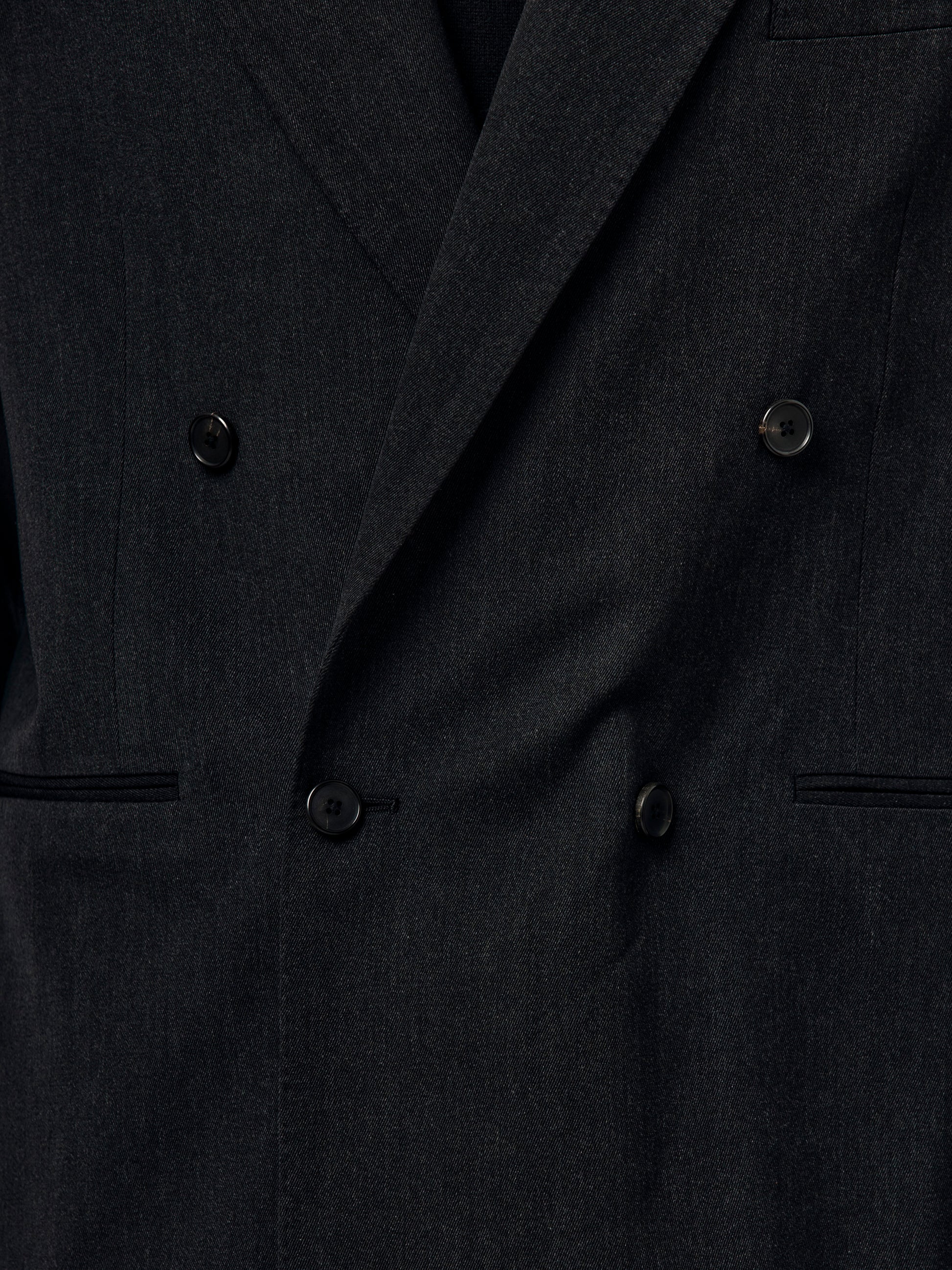 A.PRESSE builds a classic double-breasted blazer with subtle structure and a relaxed drape. The charcoal wool adds depth and texture, creating a timeless jacket that moves between tailored and casual with ease.